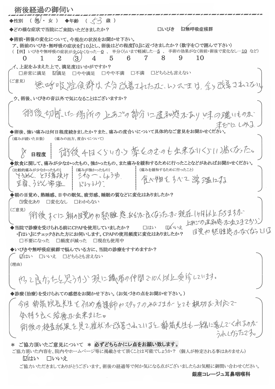 ア, 術前のいびき・無呼吸の症状を『10』だったとすると、術後はどの程度になりましたか? 【3】