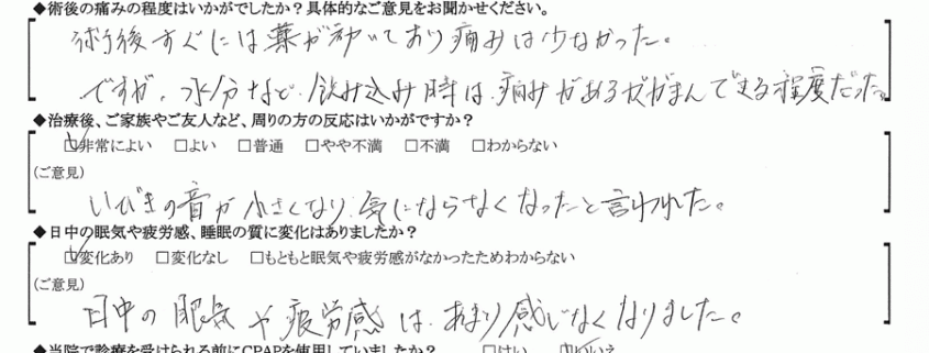 A:いびきは長年のコンプレックスでした。友人との旅行、もし病気で入院したら…など、私にとってはこの手術をしてよかったです。手術の説明もわかりやすかったです。