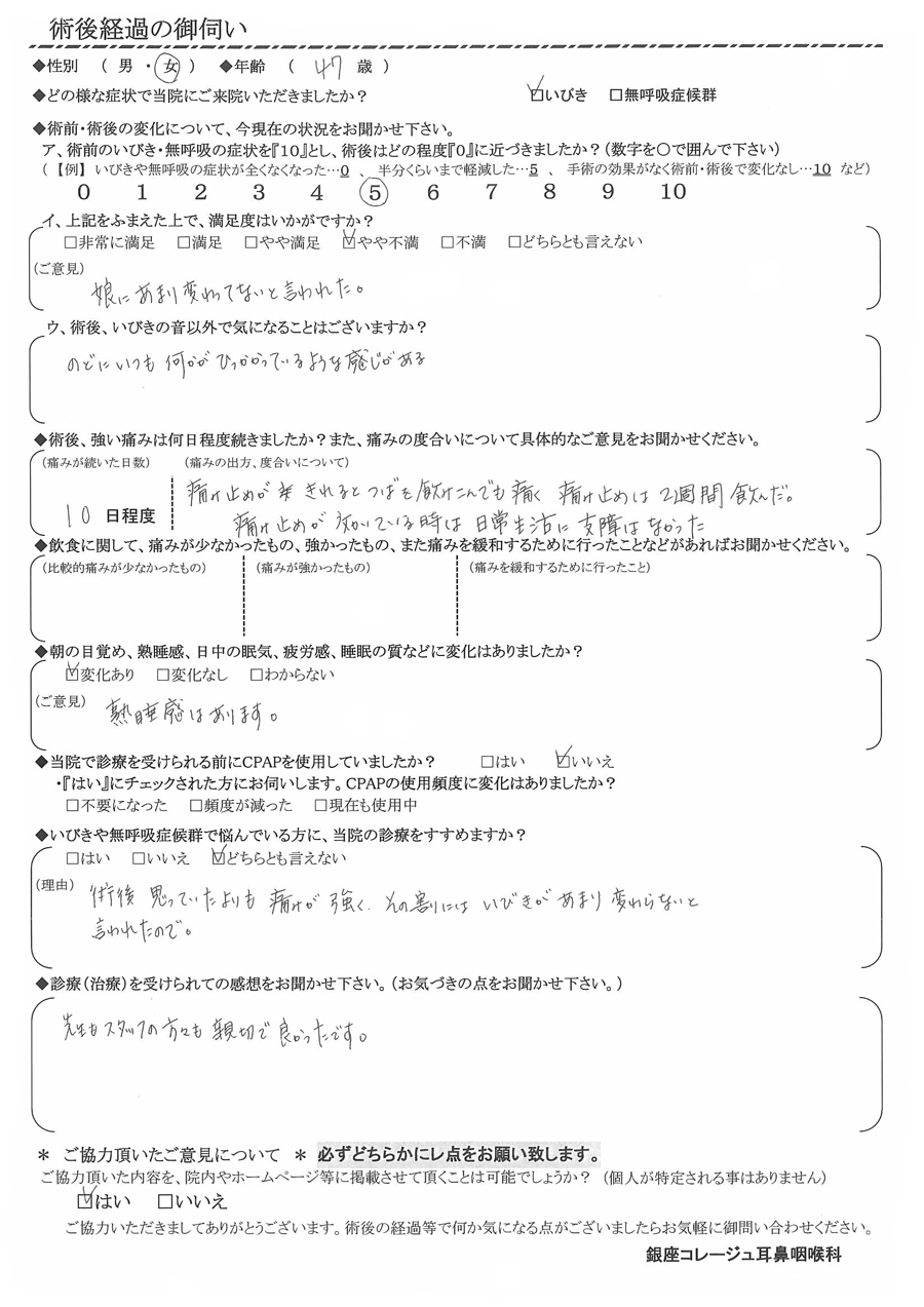 (理由) 術後思っていたよりも痛みが強く、その割にはいびきがあまり変わらないと言われたので。