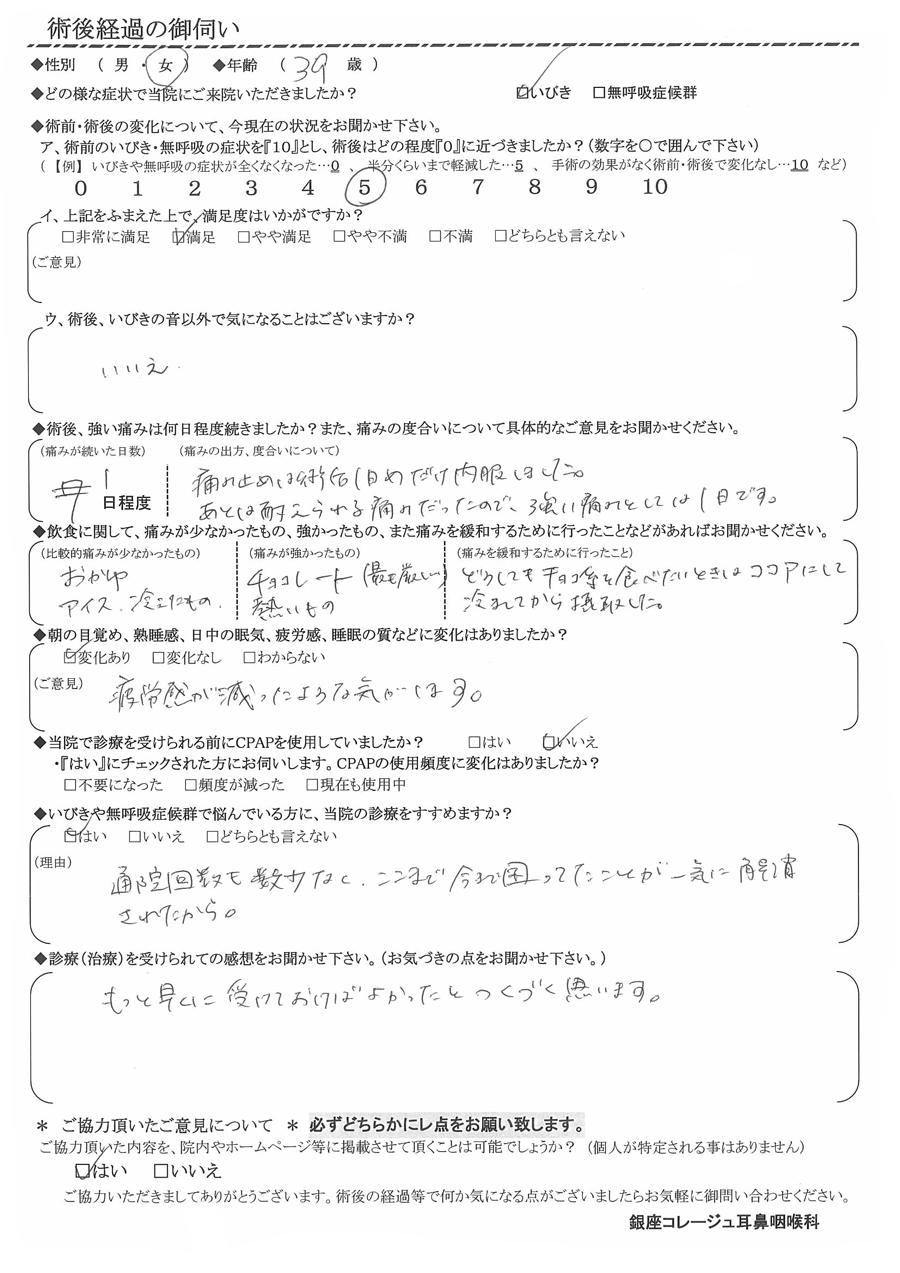ア, 術前のいびき・無呼吸の症状を『10』だったとすると、術後はどの程度になりましたか? 【5】