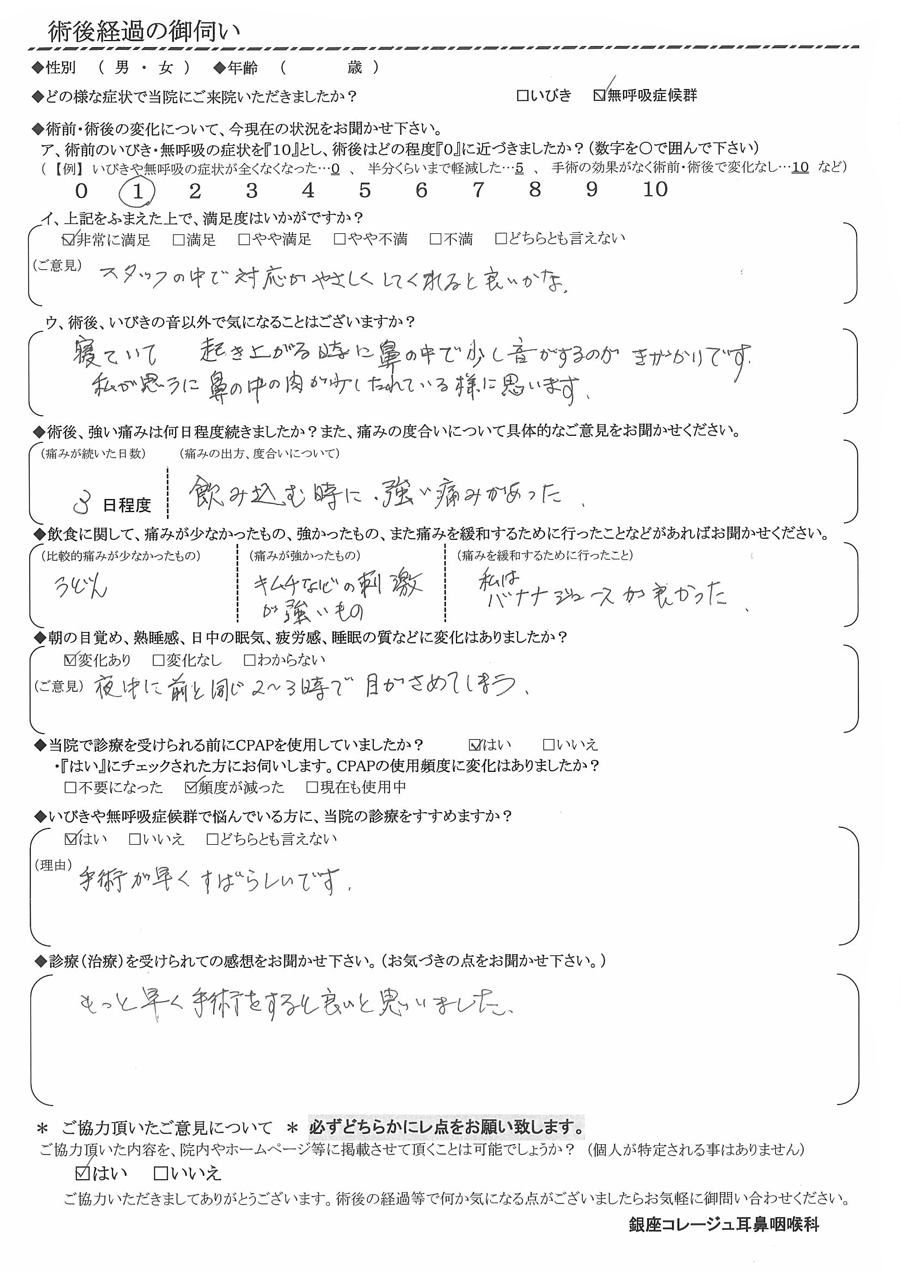 (ご意見) 幼少期より、いびきに悩まされていました。様々な種類の枕を他増してきましたが、全く改善されませんでした。それが、術後より寝息となりました!!