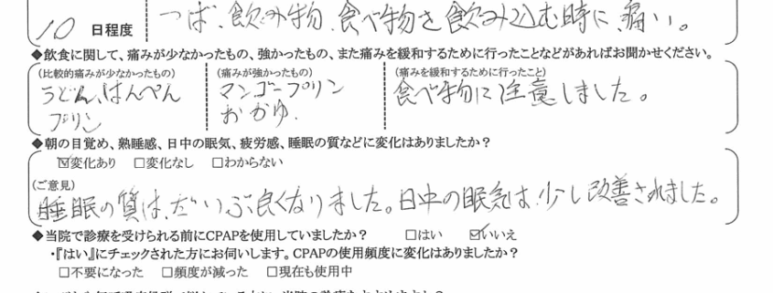 (ご意見) 睡眠の質はだいぶ良くなりました。日中の眠気は少し改善されました。