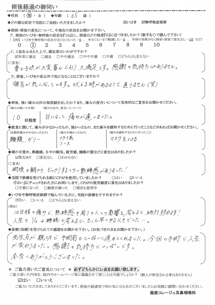 (ご意見) 術後の朝から、ビックリするくらい熟睡感がありました!