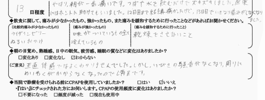 (ご意見) 正直、体感ではよく分かりませんでした。しかし、いびきの騒音が無くなり、周りに迷惑がかからなくなったので満足しています。