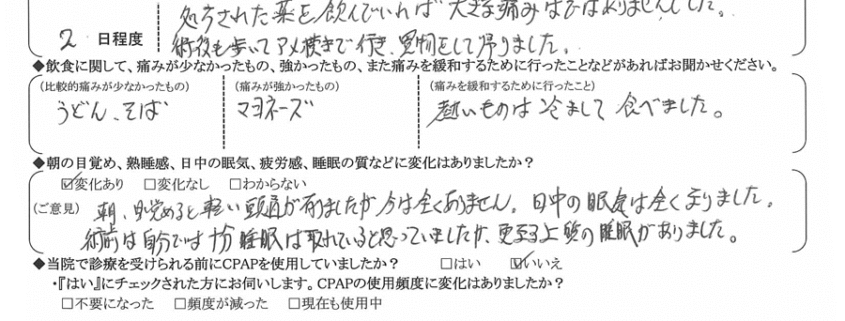 (ご意見) 朝、目覚めると軽い頭痛がありましたが、今は全くありません。日中の眠気は全く無くなりました。