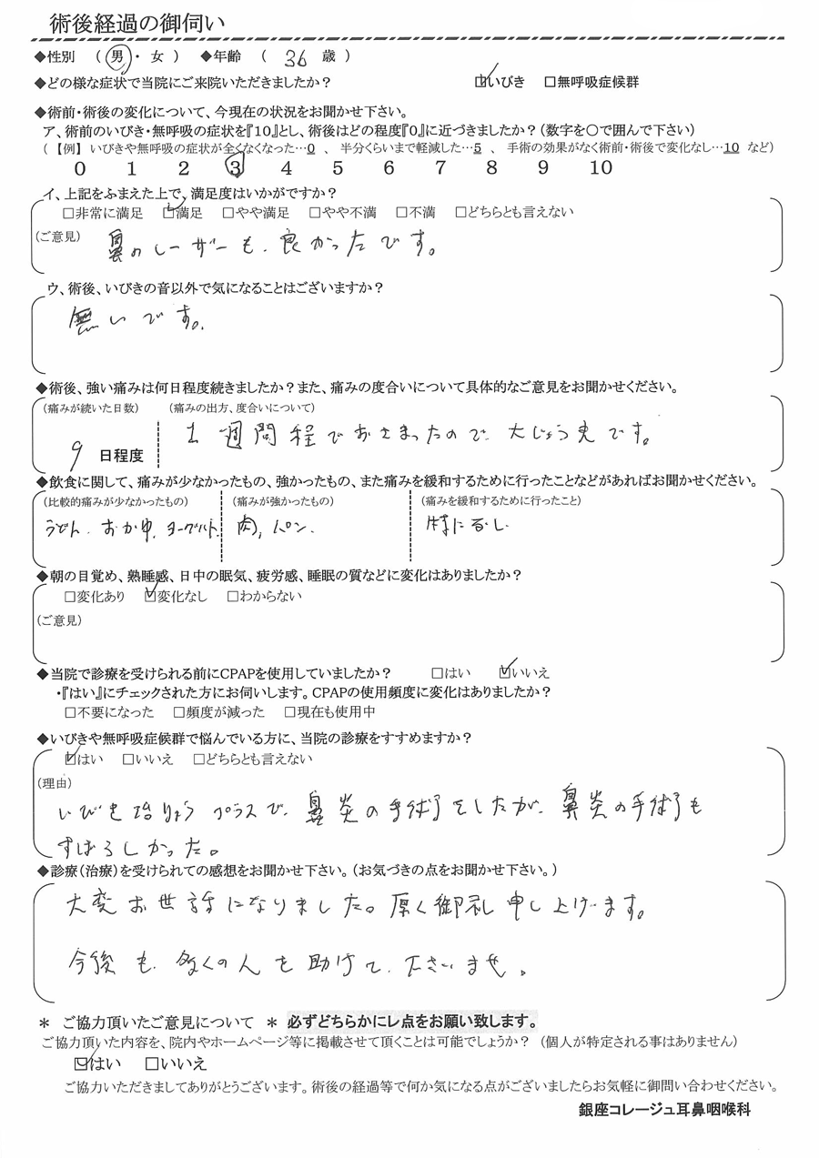 (理由) いびき治療プラスで鼻炎の手術をしたが、鼻炎の手術も素晴らしかった。