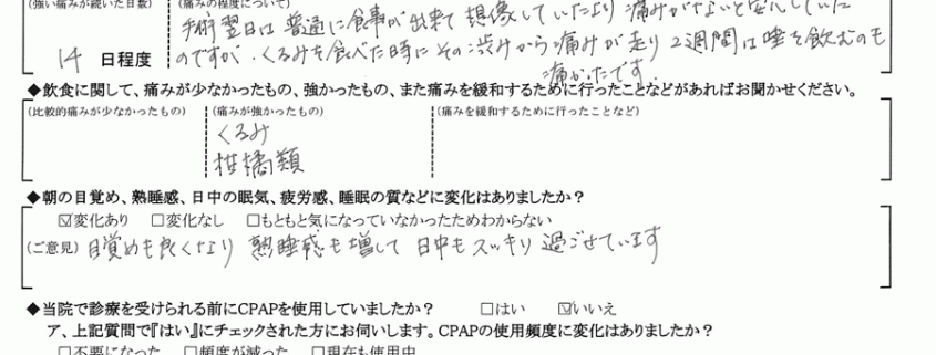 (ご意見) 家族に“いびきがなくなったね”と好評でした。これからは友達とたくさん何も考えずに旅行に行けそうです。