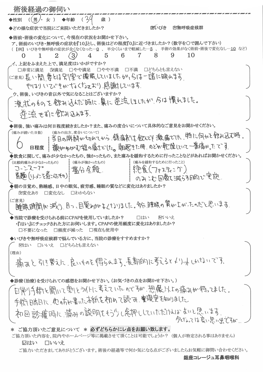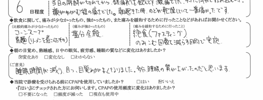 (ご意見) 長い間、妻とは別室で睡眠していましたが、今は一緒に眠れます。やはり、いびきが無くなっており感謝しています。