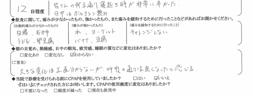 (ご意見) 無呼吸は解消されました。いびきは多少残っている。