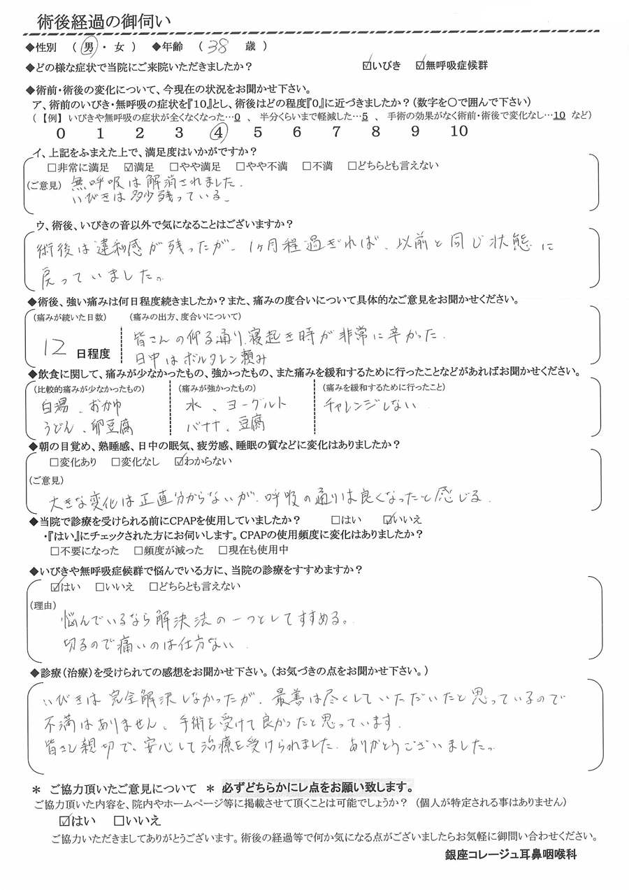 (ご意見) 無呼吸は解消されました。いびきは多少残っている。
