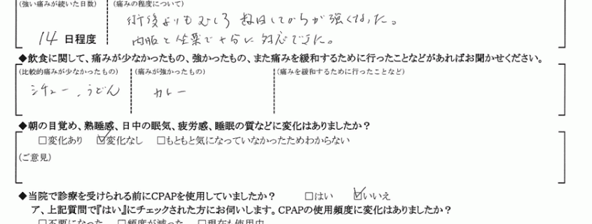 (ご意見) 目覚めはスッキリした。日中の眠気は以前よりも改善されたが100%とは言えない。いびきはしなくなった(らしい)。
