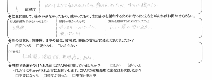 (痛みの出方、度について) 初めは水分を飲み込むのも痛みがあったが、すぐに慣れた。