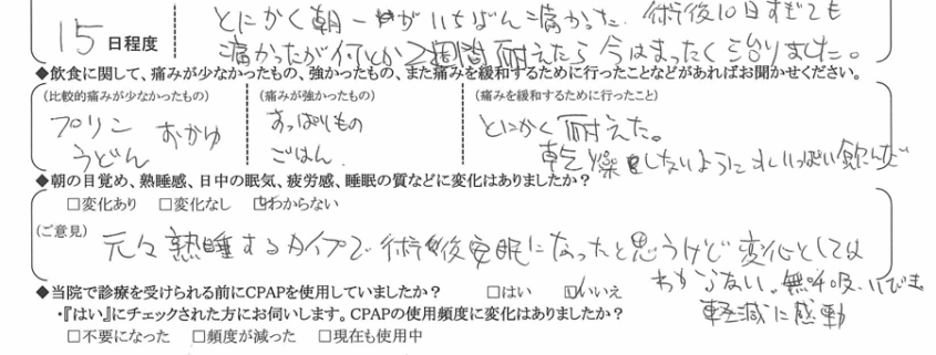 (ご意見) 元々熟睡するタイプで術後安眠になったと思うけど変化としてはわからない。無呼吸・いびき軽減に感動。