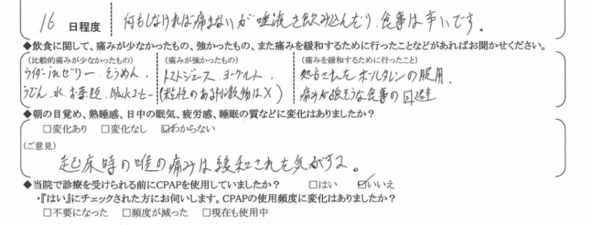 (痛みの出方、度合いについて) 何もなければ痛まないが、唾液を飲み込んだり、食事は辛いです。