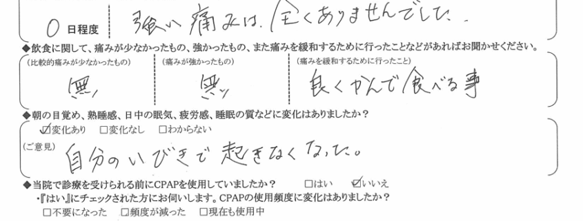 (痛みの出方、度合いについて) 強い痛みは、全くありませんでした。