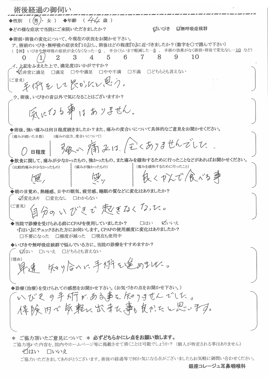 A: いびきの手術がある事を知りませんでした。保険内で気軽に出来た事も良かったと思います。