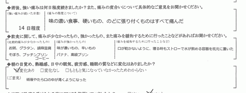 A: (痛みの程度について) 強い痛みは1週間も経たないうちになくなり、食事もある程度取れるようになりました。
