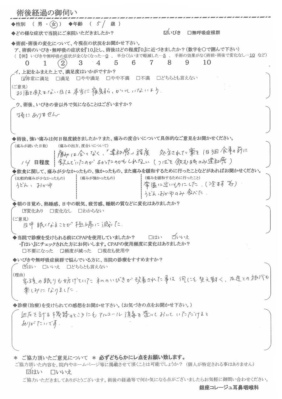(理由) 家族の眠りも妨げていた私のいびきが改善された事は何にも変え難く、友達との旅行も楽しみになりました。