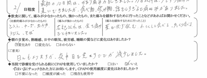 (痛みの出方、度合いについて) 最初の10日間は、かなり痛みが続きました。11日以降は少しずつ痛みが和らいできましたが、食べ物・飲み物・話をしすぎると痛みがあります。