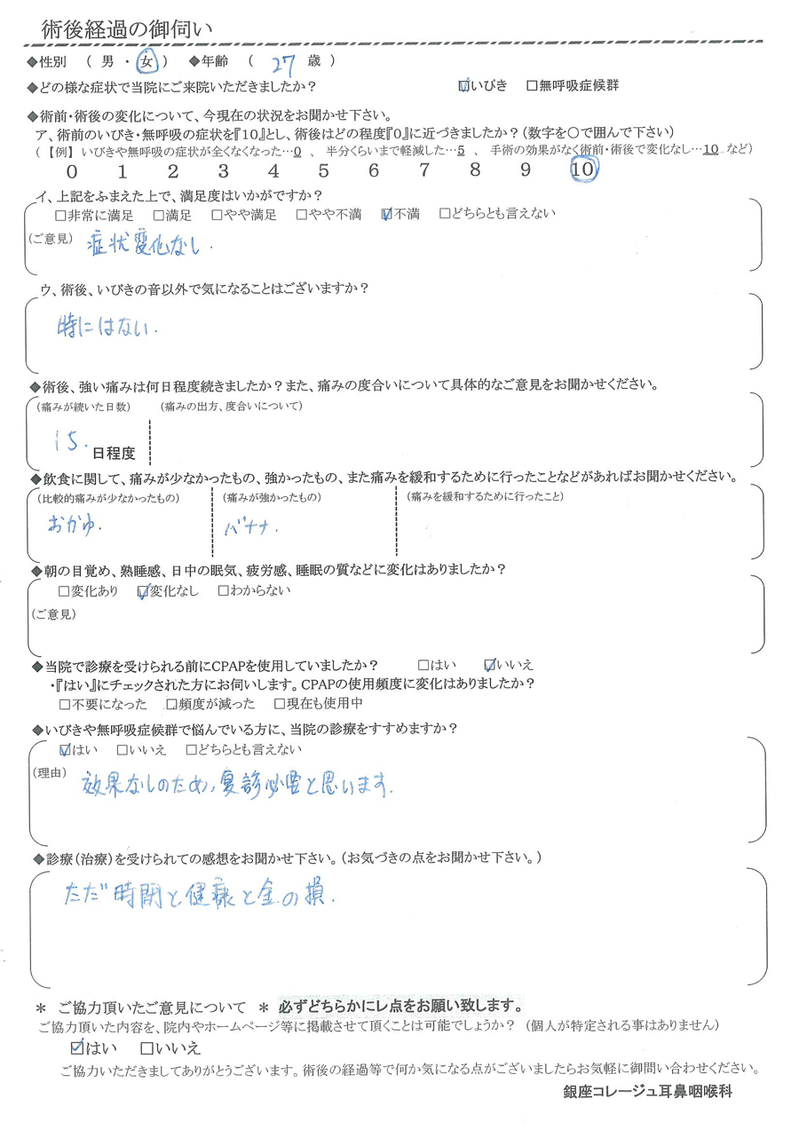ア, 術前のいびき・無呼吸の症状を『10』だったとすると、術後はどの程度になりましたか? 【10】
