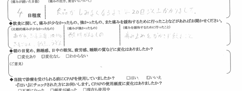 (痛みの出方、度合いについて) 食品が沁みなくなるまでは、20日以上かかりました。