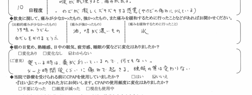 (痛みの程度について) 喉が乾燥すると、痛みが出ます。喉が激しくズキズキする感覚(火傷の痛みに似ている)