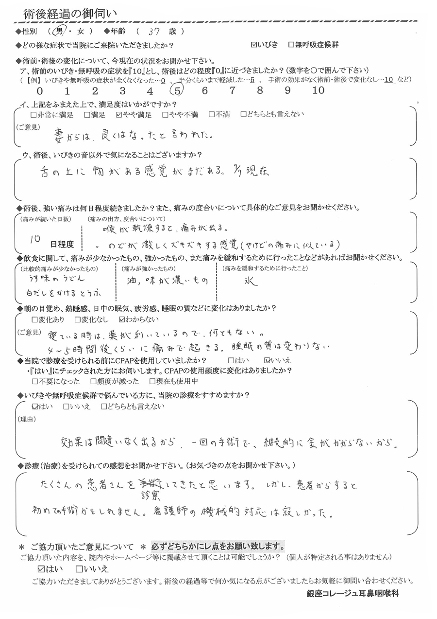 ア, 術前のいびき・無呼吸の症状を『10』だったとすると、術後はどの程度になりましたか? 【5】