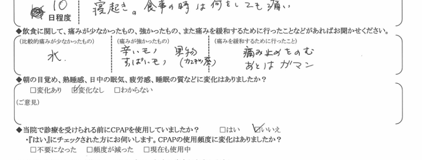 (痛みの出方、度合いについて) 寝起き。食事の時は何をしても痛い