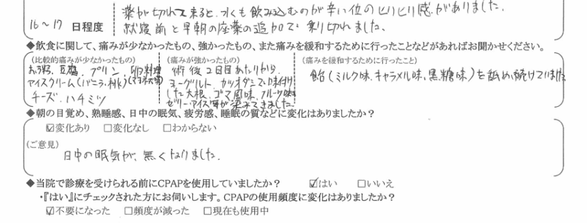 (ご意見) いびきアプリで毎晩データーを取っていますが、音のレベルが無・小・中・大とあり、術後7日目位から小・中レベルが1回(1呼吸)~20回未満に減り、朝まで無レベルに減りました。ゼロの日もありました。