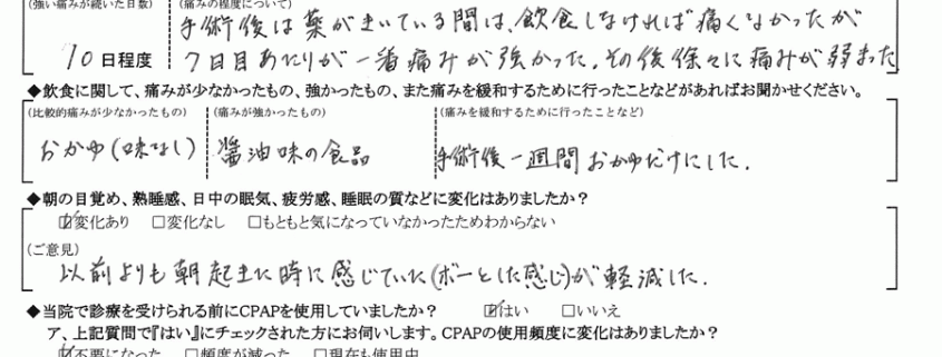 Q.術後、強い痛みは何日程度続きましたか?また、痛みの度合いについて具体的なご意見をお聞かせください。