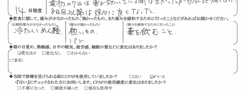 (ご意見) 睡眠の質が上がりました。もっと早く受ければ良かったと思います。