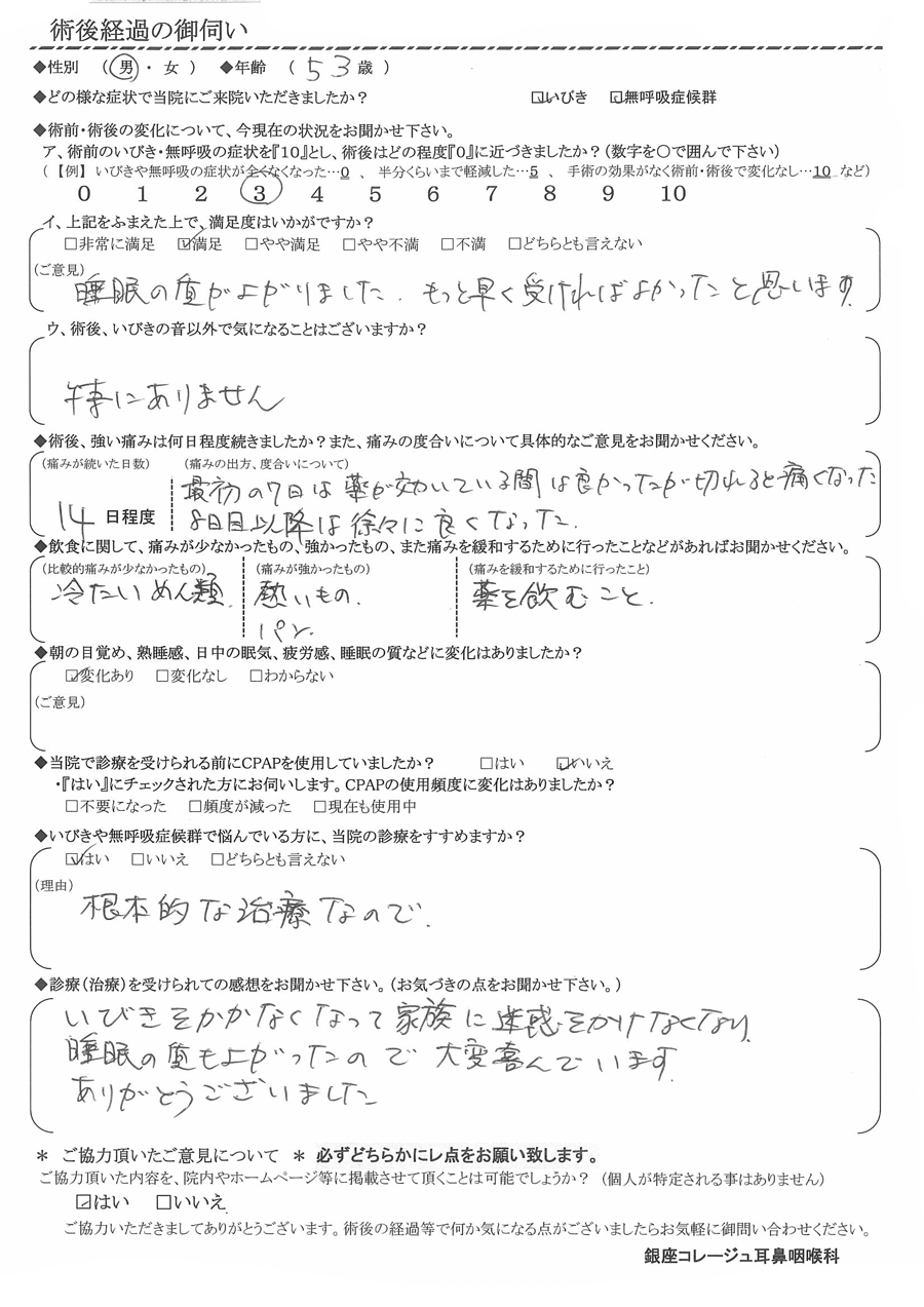 A: いびきをかかなくなって、家族に迷惑をかけなくなり、睡眠の質も上がったので大変喜んでいます。