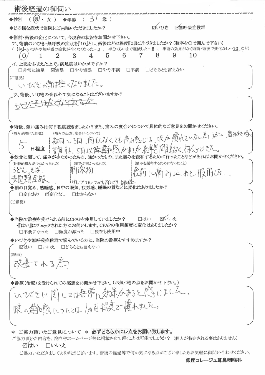 (ご意見) いびきの音は無くなりました。