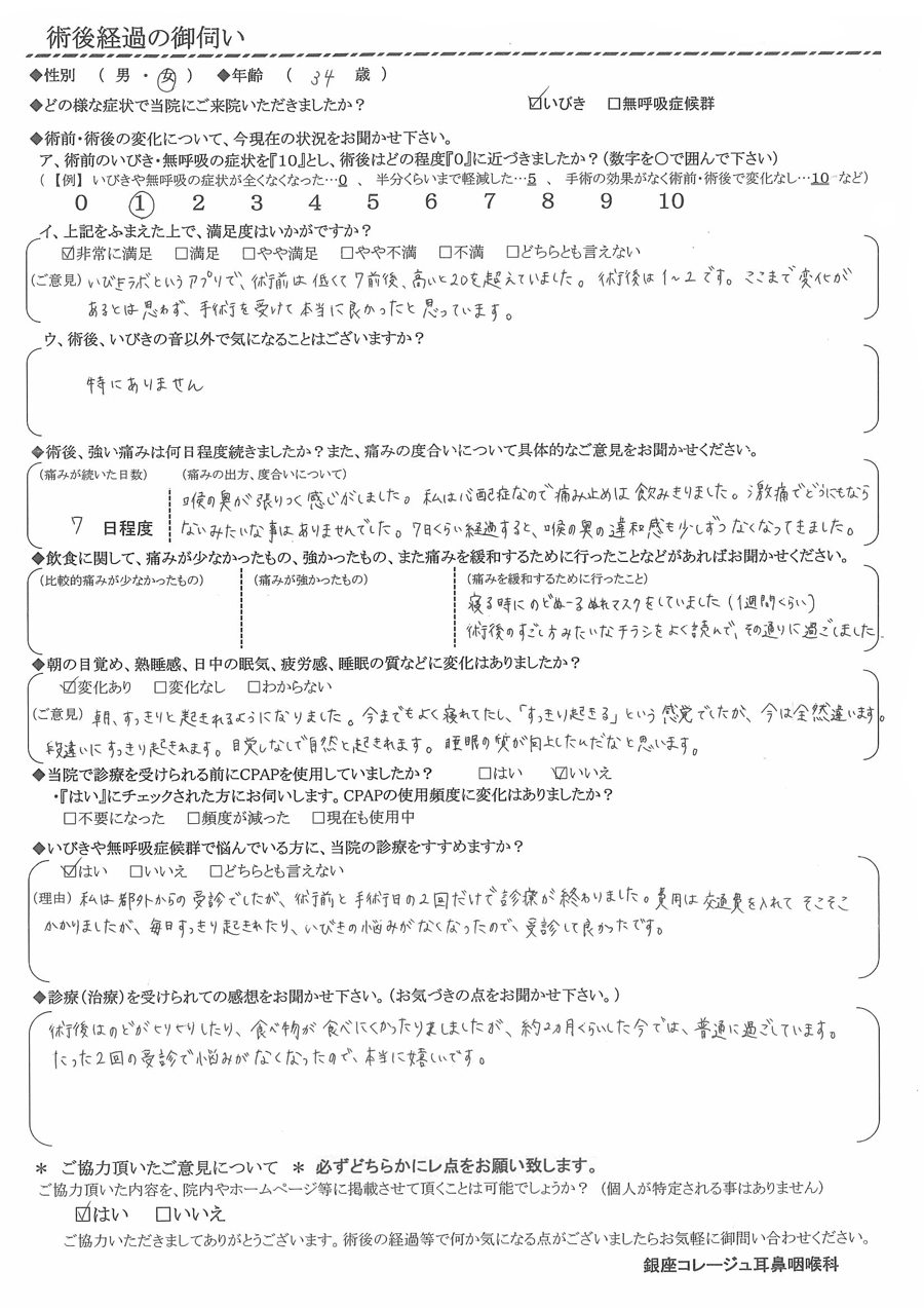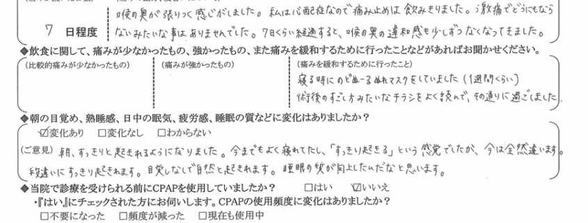 (ご意見) いびきラボというアプリで、術前は低くて7前後、高いと20を超えていました。術後は1~2です。