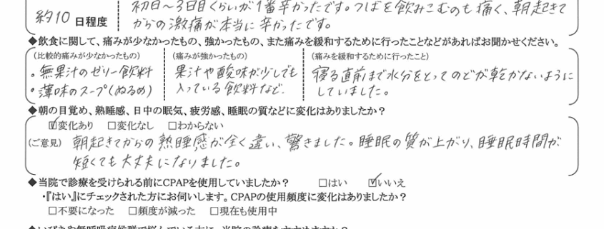(理由) いびきの改善はもちろん、睡眠の質が明らかに変わったので、早めの診療をお勧めします。術後2週間程は喉の痛みで体重が3㎏程減りましたが、その痛みの価値はあったと思います。