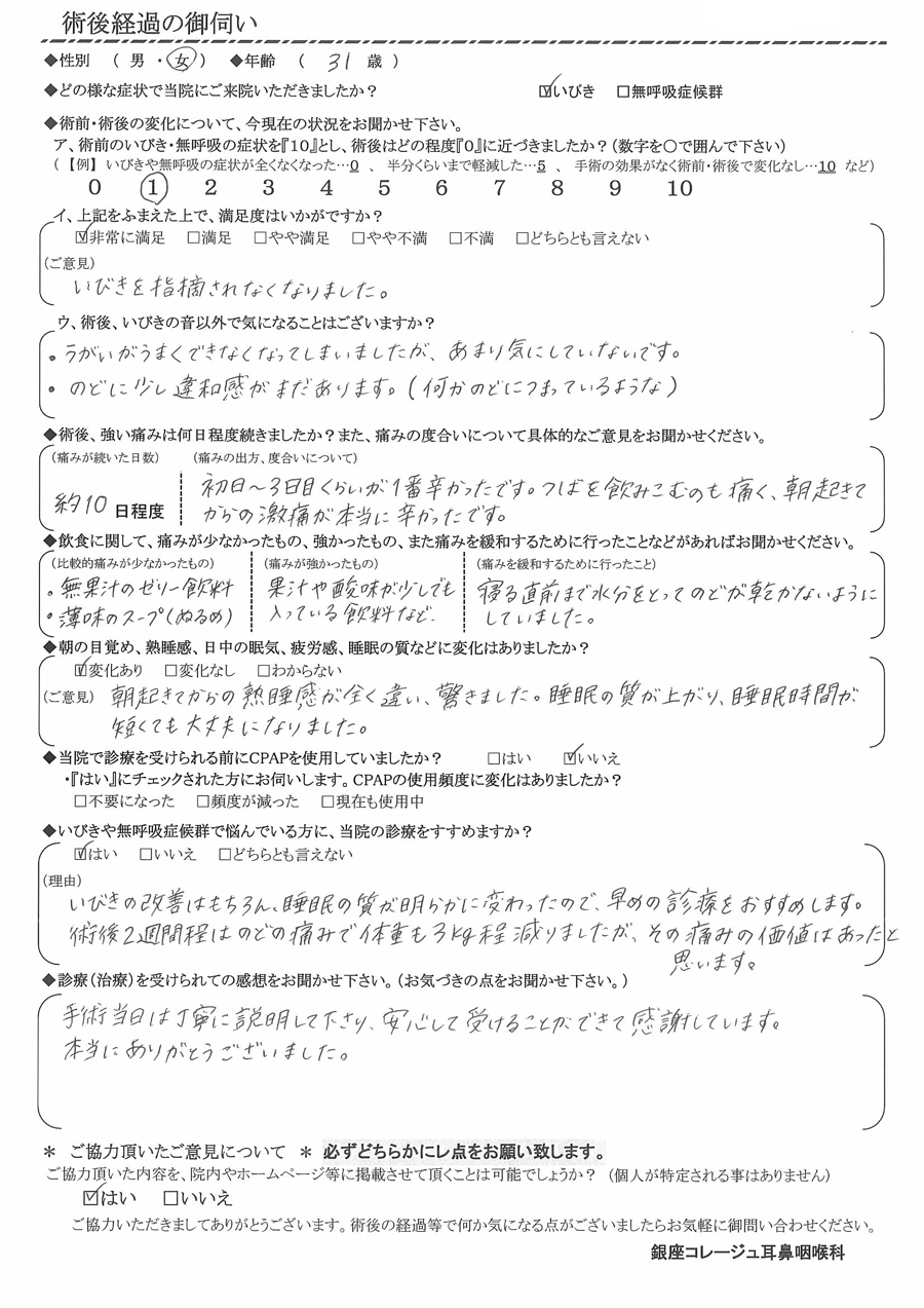(理由) いびきの改善はもちろん、睡眠の質が明らかに変わったので、早めの診療をお勧めします。術後2週間程は喉の痛みで体重が3㎏程減りましたが、その痛みの価値はあったと思います。