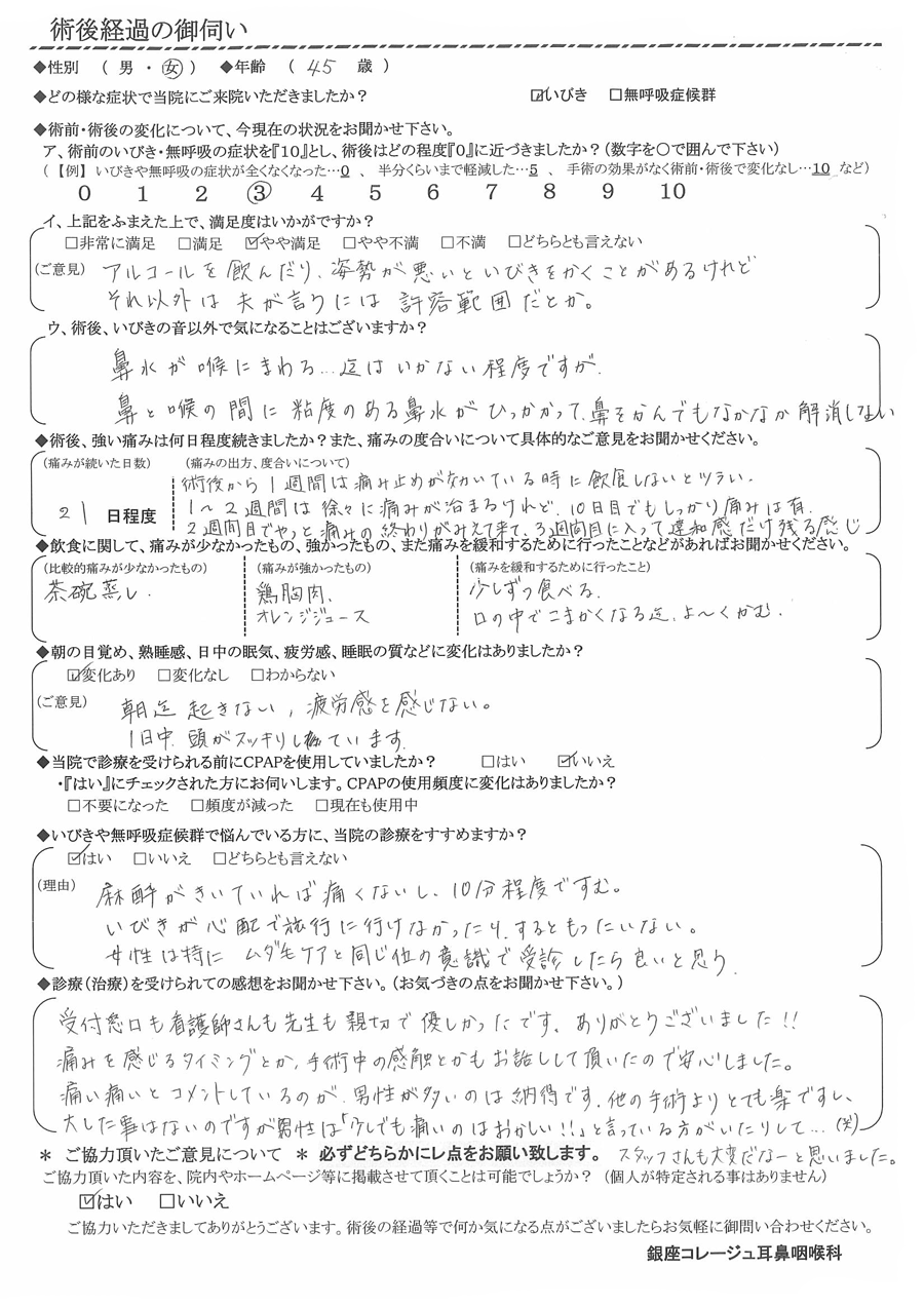 (理由) 麻酔が効いていれば痛くないし、10分程度で済む。いびきが心配で旅行に行けなかったりすると勿体ない。