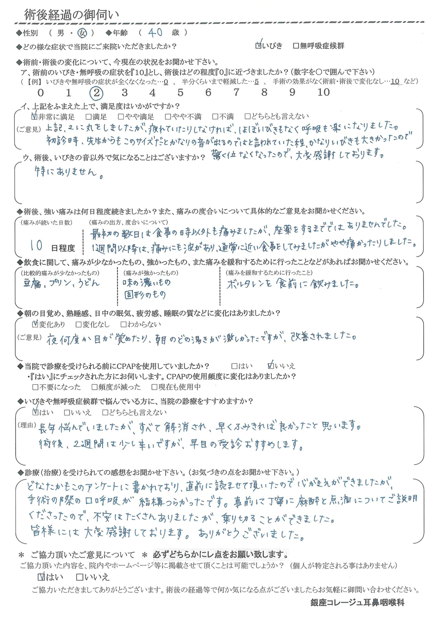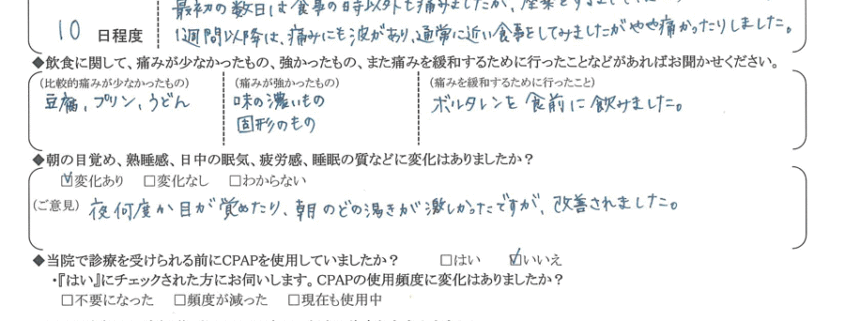 初診時、先生からもこのサイズだとかなりの音が出るのではと言われていた程、かなりいびきも大きかったので驚く位なくなったので大変感謝しております。