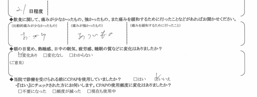 Q.術後、強い痛みは何日程度続きましたか?また、痛みの度合いについて具体的なご意見をお聞かせください。