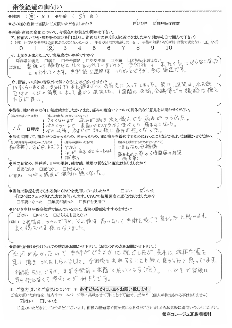(ご意見) 家族より騒音だと度々言われていましたが、手術後は全くに気ならなくなったと言われています。
