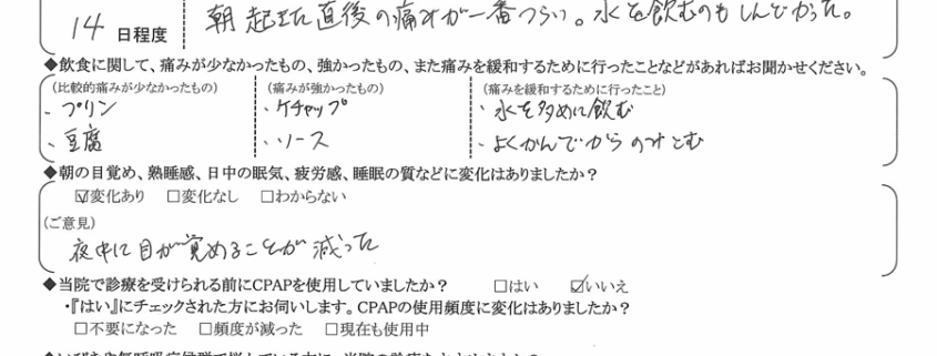 (痛みの程度について)  朝起きた直後の痛みが一番辛い。水を飲むのも、しんどかった。