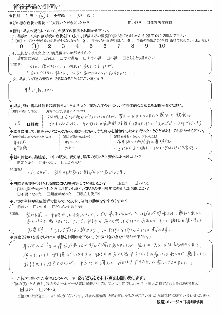 (理由) 受ける前~手術中は怖かったです。でも、長年悩んでいたいびきが改善され、勇気を出して良かったと思いました。ただ、術中の不快感はどうしてもあるので、そこに耐える覚悟は必要です。
