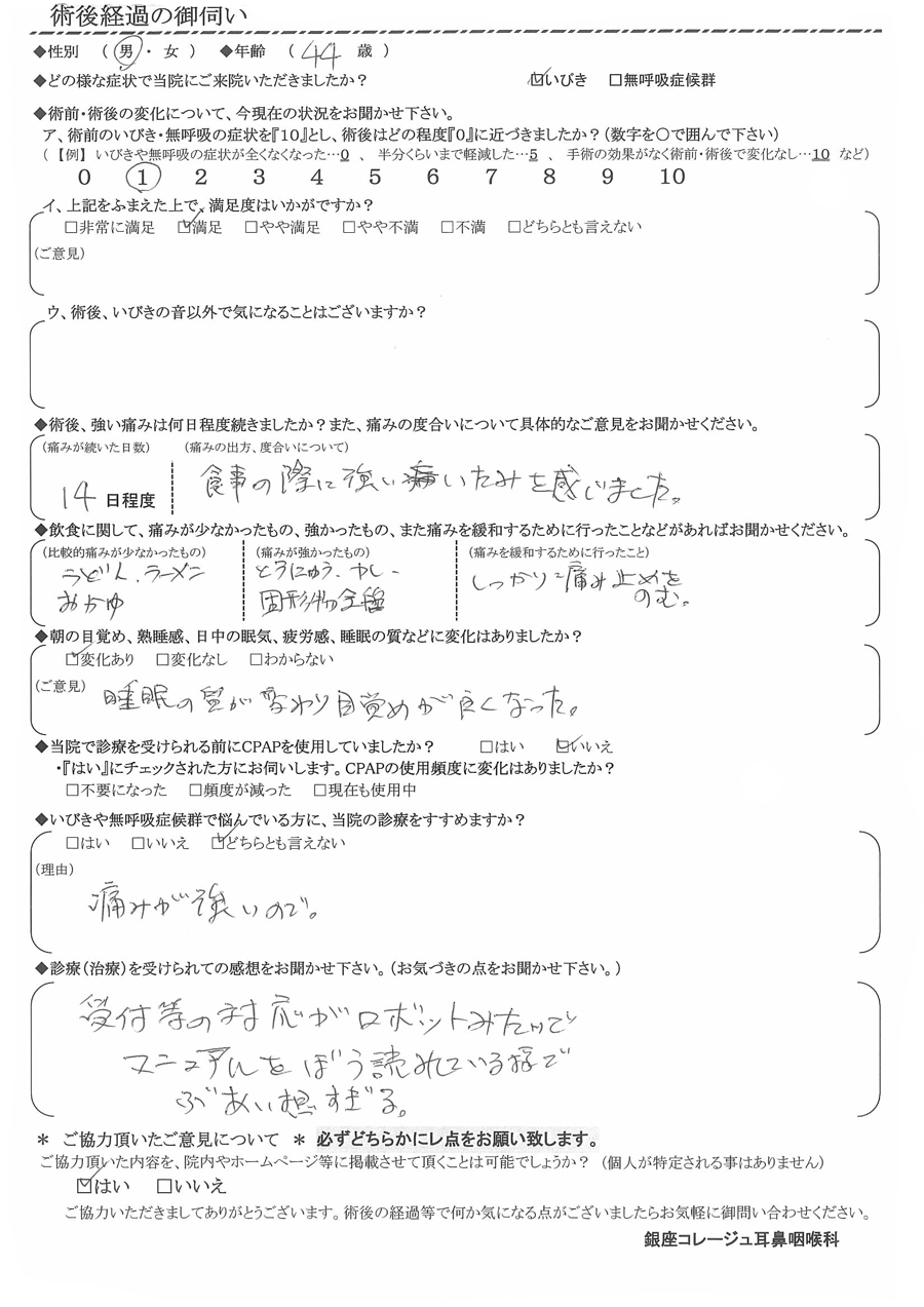 ア, 術前のいびき・無呼吸の症状を『10』だったとすると、術後はどの程度になりましたか? 【1】
