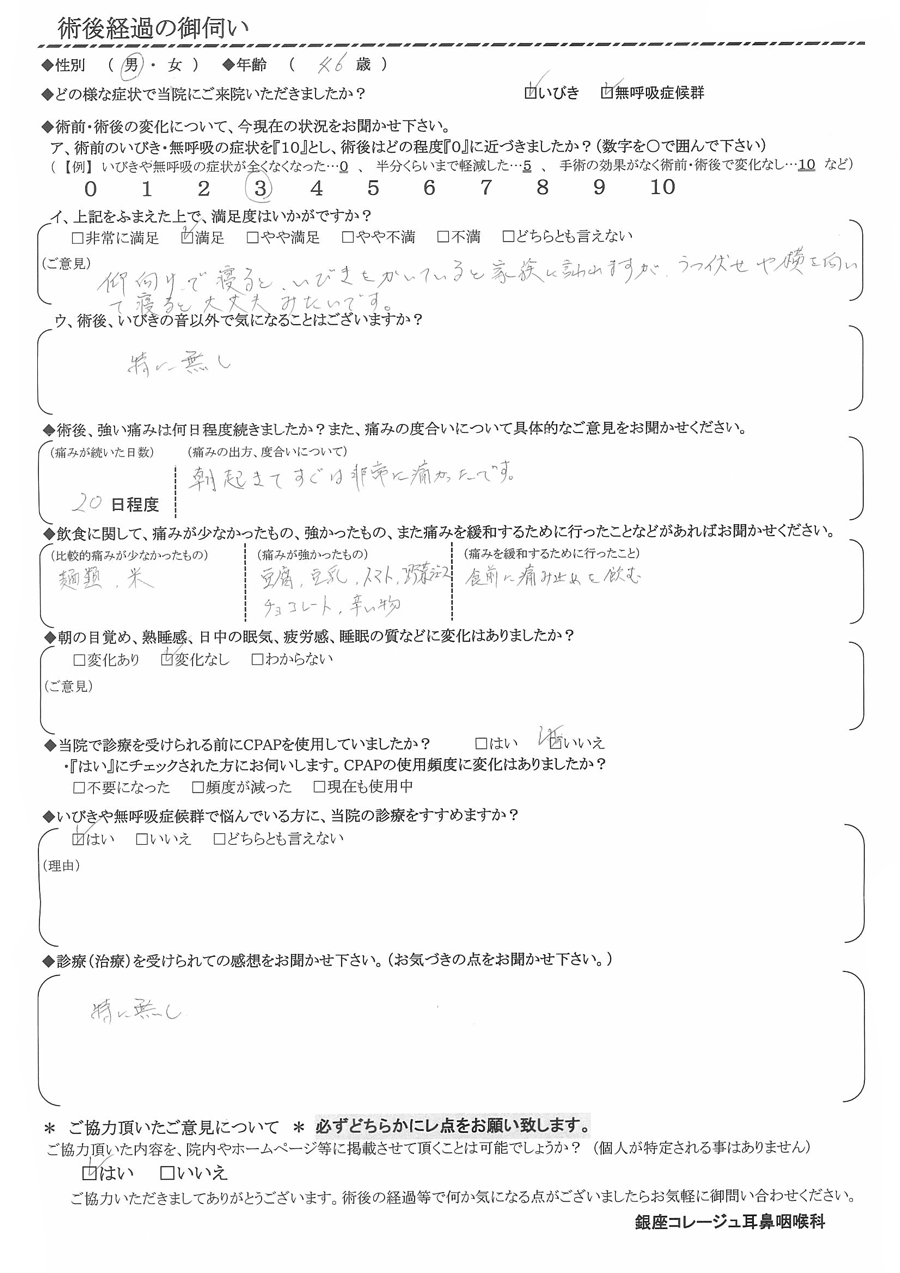 ア, 術前のいびき・無呼吸の症状を『10』だったとすると、術後はどの程度になりましたか? 【3】