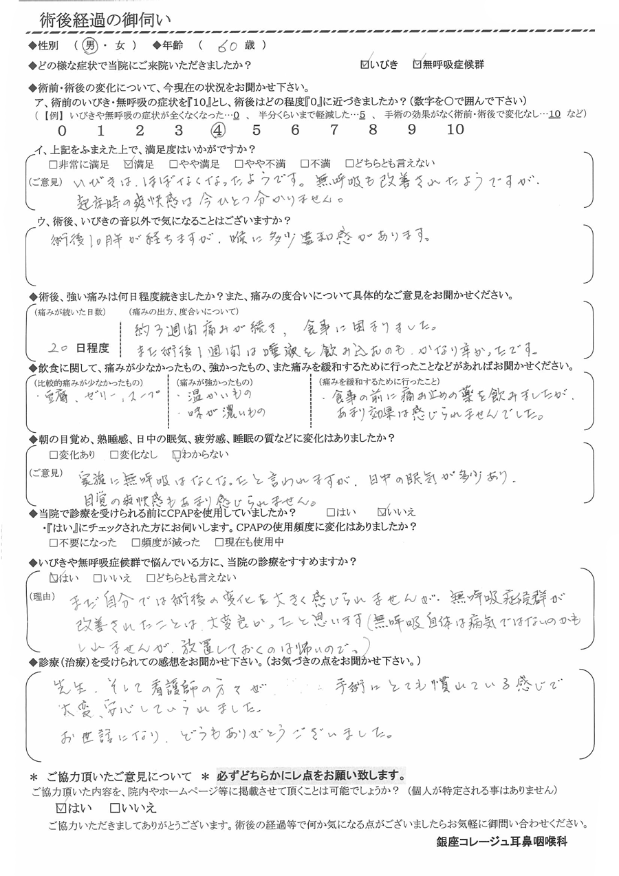 (理由) まだ自分では術後の変化を大きく感じられませんが、無呼吸症候群が改善された事は大変良かったと思います。(無呼吸自体は病気ではないのかもしれませんが、放置しておくのは怖いので。)