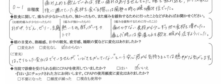 (ご意見) ハッキリした変化は出ていませんが、“いびきをかいていない”という安心感から気持ちとしては穏やかな気がします。