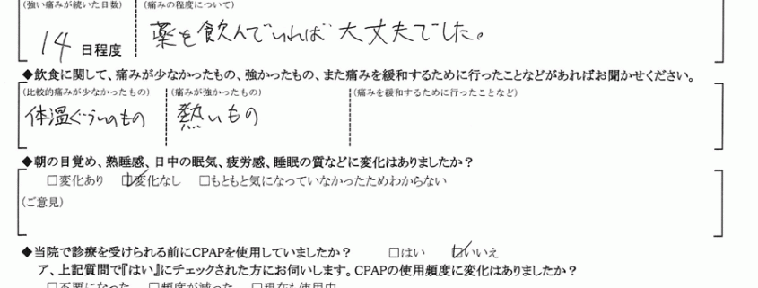 A: (痛みを緩和するために行ったこと)食事は常に常温にさました日本茶を用意してつまる感じがしたらスプーン一杯分飲みました。