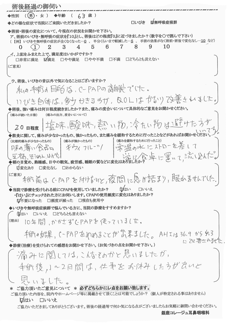 (理由) 10年間欠かさずCPAPを使っていました。手術の結果,CPAPを止めることが出来ました。 AHIは36.9から4.3に改善されました。