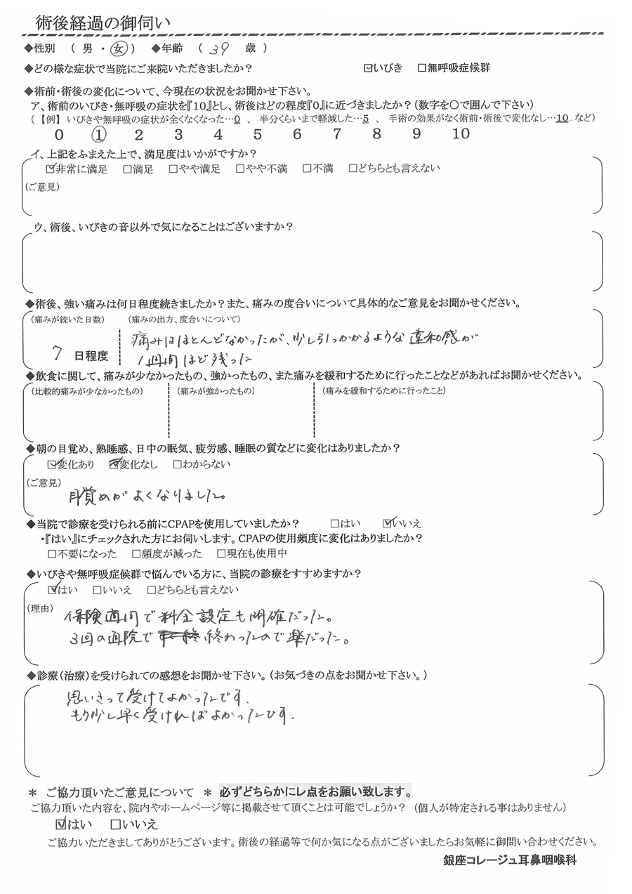 ア, 術前のいびき・無呼吸の症状を『10』だったとすると、術後はどの程度になりましたか? 【1】
