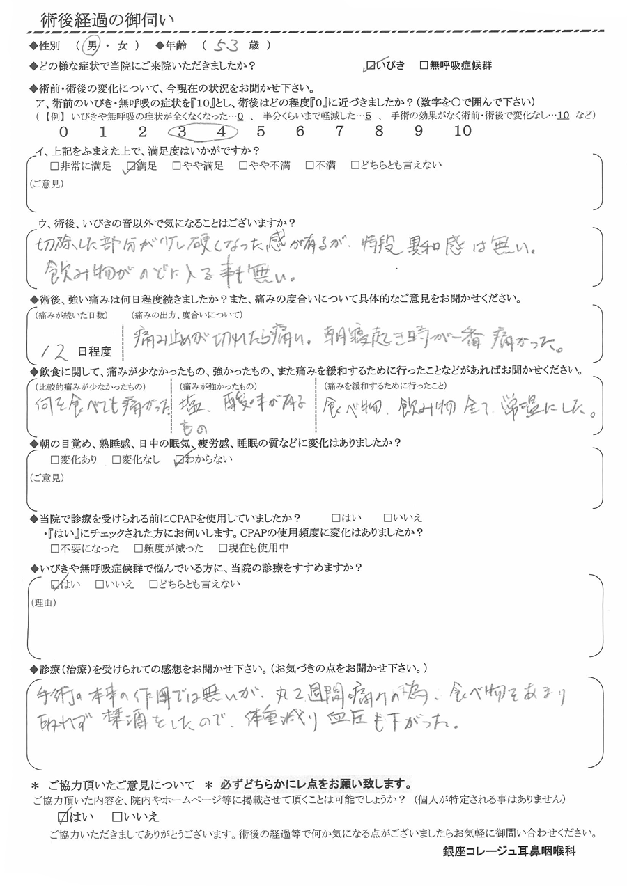 ア, 術前のいびき・無呼吸の症状を『10』だったとすると、術後はどの程度になりましたか? 【3~4】